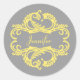 Elegant and sophisticated Chic Damask Stickers featuring a soft gray background and a stylish damask flourish embellishment in yellow. This modern design is easy to customize with your own text. Click "Customize It" to find more personalization options.