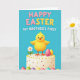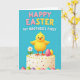 This card features a fluffy yellow chick perched on top of a white frosted cake, its wide eyes and rosy cheeks giving it a sweet, friendly look 🐰. The background is a calm sky-blue, making the chick and cake stand out while keeping the scene light and springlike. Across the upper area, rounded pink and yellow letters spell “HAPPY EASTER,” standing out clearly against the blue. Just below that, smaller white text reads “MY BROTHER’S FIRST,” centered so it feels like a gentle family note tucked into the design. The cake is dotted with yellow and red sprinkles, and a single white daisy with a golden center leans nearby like a quiet companion 🌷. Around the base, pastel eggs in pink, green, purple, and yellow form a loose ring, adding soft color and a cozy togetherness to the scene. Bright, even lighting highlights the chick’s feathery texture, the smooth frosting, and the speckled egg patterns.