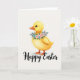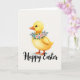 This card features a fluffy yellow chick standing sweetly against a softly textured off-white background, its round shape and downy feather detail catching gentle light. A small floral garland rests around its neck, with deep green leaves and tiny blossoms in soft pink and calm blue, like a springtime gift 🌷. The chick’s wide, shiny eyes and slight head tilt give it an affectionate, friendly look, as if it’s quietly greeting someone it cares about. Its bright orange beak and matching webbed feet add a warm contrast to the pale setting, keeping the scene simple and inviting. Below the chick, a festive greeting is placed near the bottom center in a flowing, cursive-style font, colored a medium gray that stands out without overpowering the illustration. The open space around the figure makes the garland and facial expression feel even more tender, like a gentle moment shared between close friends 🐰. The garland shows small pink petals and light blue flowers nestled among rich green leaves.