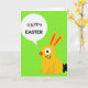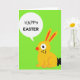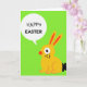This card shows a stylized yellow bunny-like character 🐰 tucked into the lower-right corner, its rounded body angled as if leaning in to greet someone close. The background is a saturated lime green field that makes the golden figure stand out, while long ears with orange inner lines reach upward like a friendly wave. A large white speech bubble floats from the upper-left toward the center, carrying the words “HAPPY EASTER” in black, hand-drawn letters. The character has one wide circular eye with a black pupil, giving it a tender, attentive look, and a few small black dots on its cheek read like freckles. Subtle outlines hint at small paws, and the simple shapes keep the scene direct and easy to read. A tiny 🌷 touch comes through in the springlike color contrast, as if the bunny is sharing a quiet, affectionate hello across the open space. A jagged, starburst-shaped black tail sits at the back of the bunny’s body, adding a sharp little accent against the smooth yellow form.