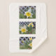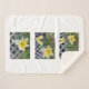 A White Small Sherpa Blanket, with 3 differen’t Pictures of Beautiful Yellow Daffodils, on it.