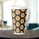 Chill out with a coffee latte in this ceramic mug that features a wrap-around photo image of a yellow Dahlia flower on a black background printed in a repeating pattern. A lovely, floral design! Select your latte mug size.