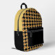 Travel with this stylish and trendy backpack that features the image of a yellow Dahlia flower bloom on a black background and printed in a tiled pattern on front side only. A fun, floral design! Top of backpack is a matching, solid yellow color. Sides, back, and zippered pouch are black.