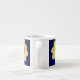 Enjoy your morning java in this espresso cup that features the photo image of a yellow Dahlia flower on a navy blue background printed in a repeating pattern. A lovely, floral design!