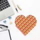 Heart shaped, spiral bound notebook for writing or sketching whose front and back covers feature the photo image of a yellow Dahlia flower on a bright, red background and printed in a repeating pattern. A fun, floral design! Select your notebook options.
