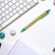 Cool and trendy, plastic pen that features an image of a yellow Dahlia flower on a lime green background and printed in a repeating pattern. Select your pen ink color and trim color.