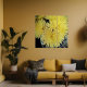 A vibrant yellow triptych with a delightful floral artwork, perfect for embracing the summer vibes. Beautiful dahlias are arranged in a lovely glass container.