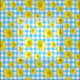 Linda Baysinger Peck’s cheerful, bright yellow daisy flower design, on turquoise and white gingham check background.
