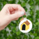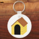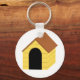 This design is of a nice looking doghouse that any dog would be happy to sleep in. This doghouse design is a yellow doghouse with a tan sloping roof to it. This doghouse design looks great on this keychain. Perfect for yourself or as a gift
