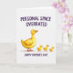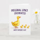 This card shows a large yellow duck on the left, with a calm, watchful look that feels protective and affectionate ❤️. Three smaller ducklings trail close behind in a neat line, their tiny bodies tucked so near that it reads like an eager cuddle in motion. The birds are shaded in sunny yellow with warm orange beaks and webbed feet, and light feather texture adds softness without getting fussy. The background is white with faint diagonal lines that give a gentle rhythm, keeping the focus on the close-knit group. Near the top, the phrase “PERSONAL SPACE OVERRATED” sits in deep purple lettering, adding a teasing, friendly joke to the scene. Near the bottom, “HAPPY MOTHER’S DAY!” appears in matching purple, centered beneath the ducks like a tidy sign-off 🌼. The closeness between the lead duck and the ducklings creates a tender, slightly funny sense of togetherness, like they simply won’t let go of each other. The purple text stands out clearly against the pale backdrop, with the top line above the ducks and the greeting placed below them.