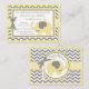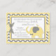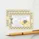 Grey and white chevron print with yellow accents with bird perched on elephant with bow-tie and a 3D-look polka-dot bow bring a book card design for a baby shower.