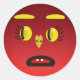 Yellow eyed sad face sticker. The face is red, the eyes are yellow, she has two front teeth, a heart nose, and yellow eyebrows.