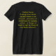 My overall review is that the T-shirt is nice, it fits true to size however the font is significantly smaller than advertised and you can't read it. The printing is unreadable and there is a strain to read it. It does not look like the advertised product. Maybe the shirt color is darker or a larger more visible font should have been used. Photos with and without flash and font is barely legible.