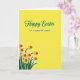 This card features a bright yellow background that fills the whole front like warm spring sunshine. Near the top center, the message “Happy Easter to a special aunt” is written in deep green lettering, with the main words in a flowing style and a smaller line in a classic serif look. The strong green-on-yellow contrast makes the text easy to read while still feeling gentle and affectionate. Down in the lower left, a small cluster of spring flowers leans together as if in a friendly little huddle, adding a soft touch of closeness. Each bloom has yellow petals, a deep orange-red center, and a thin white outline that makes the shapes stand out. Dark green stems and leaves echo the text color, tying the layout together, and a tiny 🌷 or 🐰 detail can fit naturally with the Easter theme. The flowers sit low and left, with open yellow space around them and the green greeting centered above.