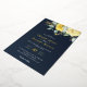 This contemporary floral wedding invitation features a classy and elegant bouquet of yellow watercolor roses, complemented with delicate greenery and accented with shiny real foil golden leaves over a navy blue background. Easily add the Bride and Groom names and the wedding date in gold foil, and all the other details in elegant white fonts.