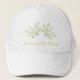 This lovely yellow floral Mother of the Bride wedding hat just glows with the joy of the celebration. It is decorated with two white daffodils. The text can be customized to suit your individual occasion. Perfect for the related rehearsal dinner, brunch or bachelorette celebrations.