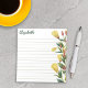 Personalized floral notepad with practical lines and your name in a green script and yellow flowers adorning the right side of the notepad. Evening primrose notepad with a lined paper and personalized with your name in a charming green script. Personalized notepad printed with illustrations of yellow flowers, green leaves, and flower buds.