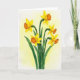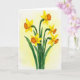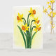 Designed with a cheerful bouquet of six golden-yellow, trumpet-shaped flowers as the main focus, rising from the lower edge like an offered handful of spring 🌷. Dark green stems with slight tonal shifts gather them together, giving the arrangement a close, companionable feel. Each bloom has gently curved petals that open toward the viewer, as if leaning in the way friends do during a shared laugh. In the center of every flower, a ruffled orange-red cup adds rich contrast and a touch of warmth that reads like a quiet, affectionate glow. The background is a soft wash of pale yellow fading into white, creating a light halo that keeps the scene airy and bright 🐇. There is no visible message on the front, leaving open white space where a short greeting could sit near the top in a simple, dark ink. Fine line details trace the petal edges and the frilled centers, while the color softly pools along the folds and near the stem joints.