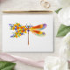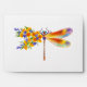 Artistically painted, floral dragonfly in contrasting orange and purple with yellow, bright, blooming California poppy and blue wildflowers on white background.