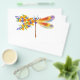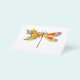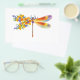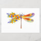 Artistically painted, floral dragonfly in contrasting orange and purple with yellow, bright, blooming California poppy and blue wildflowers on white background.