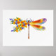 Artistically painted, floral dragonfly in contrasting orange and purple with yellow, bright, blooming California poppy and blue wildflowers on white background.