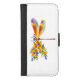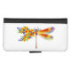Artistically painted, floral dragonfly in contrasting orange and purple with yellow, bright, blooming California poppy and blue wildflowers on white background.