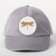 Artistically painted, floral dragonfly in contrasting orange and purple with yellow, bright, blooming California poppy and blue wildflowers on white background.