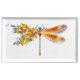 Artistically painted, floral dragonfly in contrasting orange and purple with yellow, bright, blooming California poppy and blue wildflowers on white background.