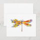 Artistically painted, floral dragonfly in contrasting orange and purple with yellow, bright, blooming California poppy and blue wildflowers on white background.