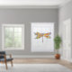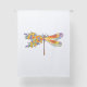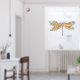 Artistically painted, floral dragonfly in contrasting orange and purple with yellow, bright, blooming California poppy and blue wildflowers on white background.