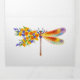 Artistically painted, floral dragonfly in contrasting orange and purple with yellow, bright, blooming California poppy and blue wildflowers on white background.