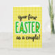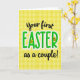 This design shows a sunny yellow gingham background that feels like a spring picnic shared by two people leaning close in quiet affection 🌷. Centered text is stacked in three lines, with “Your first” at the top and “as a couple!” at the bottom in flowing black lettering that gently frames the main word. The middle line reads “EASTER” in large green letters, placed squarely in the center so it becomes the focal point between the two smaller lines. A soft white halo around the green letters adds a light, airy touch, like morning sun over fresh grass. Inside the open spaces of the “A” and “R,” small oval shapes appear like decorated eggs, colored golden-yellow with thin black stripes for a sweet seasonal nod 🐰. The mix of green, yellow, and black keeps the look bright and balanced while still feeling intimate, like a shared first celebration captured in design. The message remains centered on the page, with generous space around it so the pattern and lettering can breathe. Two striped golden ovals sit neatly inside the “A” and “R” of the green “EASTER” text against the yellow checkered backdrop.