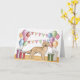 Destei's original cartoon illustration of a yellow color Golden Retriever breed dog standing among some pastel color birthday balloons, gifts and a bunting banner. The pastel colors include pink, green, blue, red, orange and purple. The dog is standing on a yellow wood floor texture and the background has a playful pastel color polka dot pattern. On the inside of the card there is also a personalizable text area for a custom message.