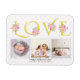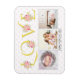 Yellow LOVE typography and pink roses Valentines Day magnet. It features the word "LOVE" in a decorative relief font in illuminating yellow with ultimate gray shadow,, bouquets of pink roses and three photos. One photo is curtesy of Photography © Storytree Studios, Stanford, CA