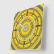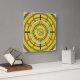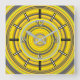 This square clock design features a pattern of nested circle shapes colored various shades of colors like yellow and gray. It also features rectangles marking the hours, and numbers indicating the hours "12", "3", "6", and "9".