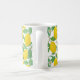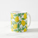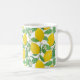 Decorative design of a pattern of yellow juicy lemons on branches with green leaves and delicate white flowers on a white background.