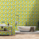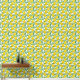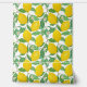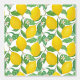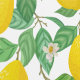 Decorative design of a pattern of yellow juicy lemons on branches with green leaves and delicate white flowers on a white background.