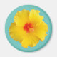 A decorative round magnet with an original photo of a yellow hibiscus flower with a orange red center that blooms in my garden. It's a beautiful, summer flower that's popular in tropical gardens. Accent your fridge this season with this cheery flower! Shown here with a teal green, custom background color. Change it to your favorite color and add any text if desired. Great for anyone that loves flowers!