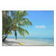 Placemat with a yellow kayak under a hanging palm tree on a white sand beach on the tropical island of Moorea, near Tahiti, in the Pacific archipelago French Polynesia.