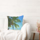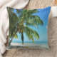 Throw pillow with a yellow kayak under a hanging palm tree on a white sand beach on the tropical island of Moorea, near Tahiti, in the Pacific archipelago French Polynesia.
