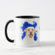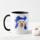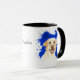A beautiful water color portrait of a yellow Labrador Retriever stands out against a bright blue abstract paint splatter background. The image is on two sides of the mug, with your name or other custom text in black between them.
