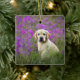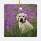 This ornament features two different images of yellow Labrador retrievers amongst the wildflowers.