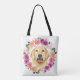 This pretty tote bag has a watercolor yellow Labrador Retriever Dog inside a floral wreath of purple, pink, peach, yellow, blue, and green watercolor flowers and leaves.