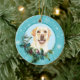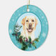 On the front of this Holiday ornament is a beautiful portrait of a yellow Labrador Retriever dog peeking out of a holly and evergreen bough. Red berries and pine cones decorate the holly and pine sprigs. The image is placed on a pale blue circle framed by a retro blue snowflake pattern. The back of the ornament has the same background and circle with your custom text in blue.