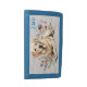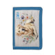 Wallet for men or women with yellow lab dog design. A pretty dog image, with wildflowers and a wood grain background, is the design with a place for three initials in the upper corner. Shown with blue trim which matches the monogram.