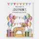 Destei's original cartoon illustration of a cute yellow Labrador Retriever breed dog. The dog is placed in a colorful birthday setting with pastel color birthday balloons, gifts and a bunting banner. The pastel colors include pink, green, blue, red, orange and purple. The dog is standing on a yellow wood floor texture and the background has a playful pastel color polka dot pattern. There are also three personalizable text areas.