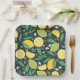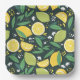 Paper plates with a cute pattern featuring yellow lemons and green lime fruit with stalks of leaves set on a dark green background.