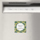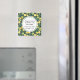 A favor magnet with a cute pattern featuring yellow lemons and green lime fruit with stalks of leaves set on a dark green background.