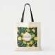 Tote bag with a cute pattern featuring yellow lemons and green lime fruit with stalks of leaves set on a dark green background.