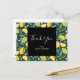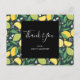 Thank you postcard with a pretty pattern featuring yellow lemons and green lime fruit with stalks of leaves set on a dark green background.